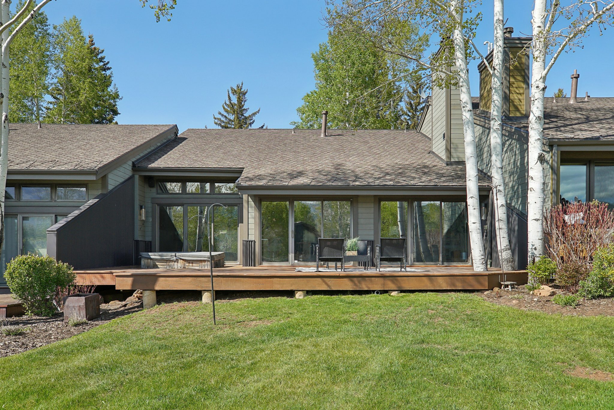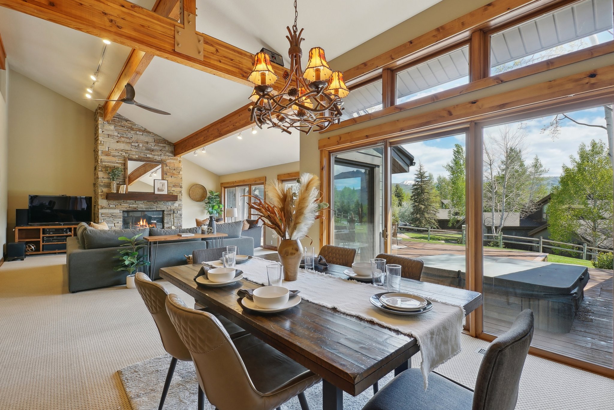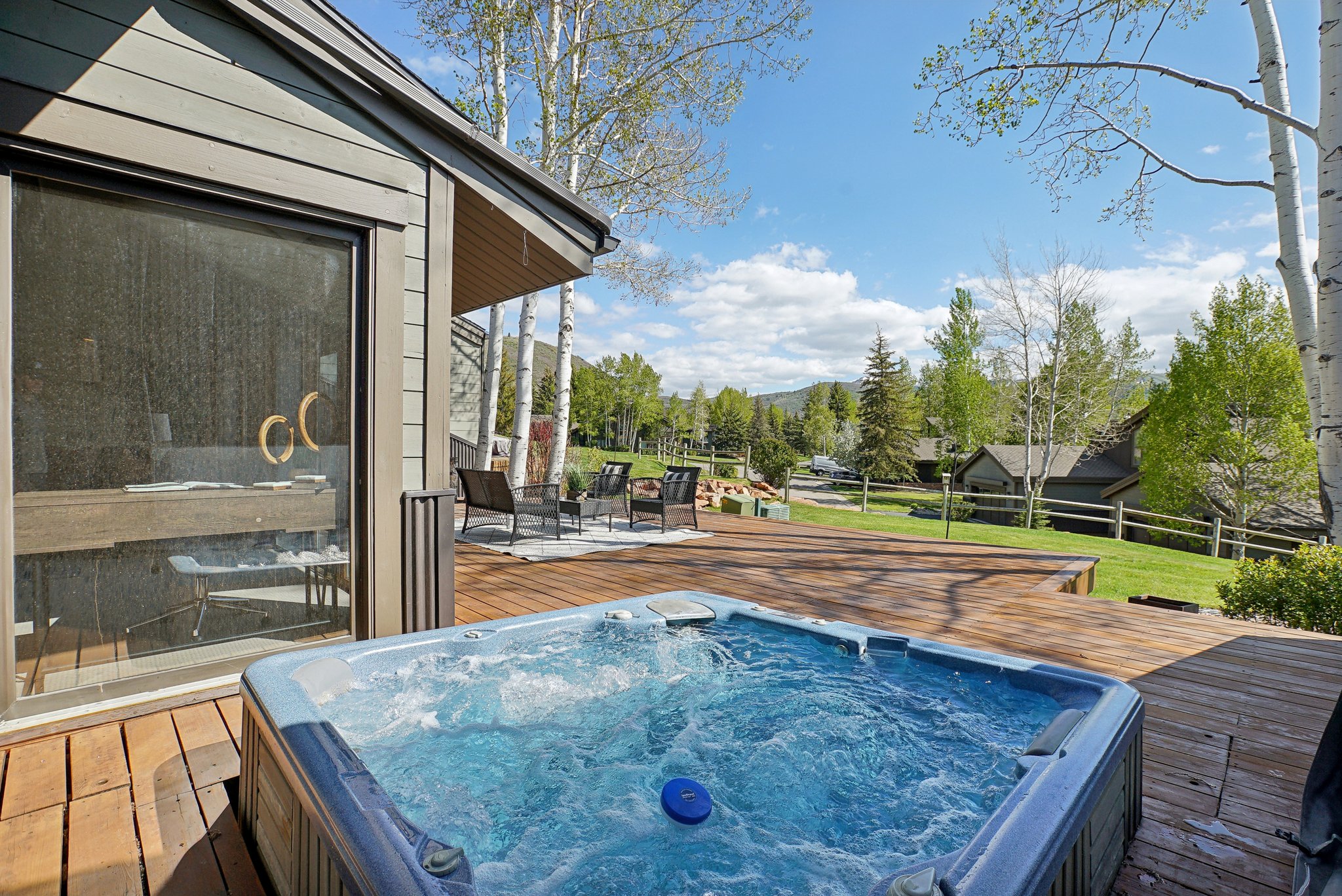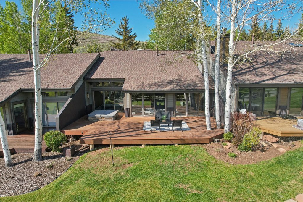 The property lives like a single family home, and features an open floor plan with a large great room with vaulted ceilings and floor-to-ceiling stonework, double master suites, two-car garage, plentiful storage, and upgraded finishes. The expansive deck provides the perfect spot for entertaining, relaxing, and soaking in the mountain views. The property backs to mature landscaping and the Park Meadows golf course, offering privacy for social gatherings and soaks in the hot tub. Free transit stops just few hundred feet away, with direct service to Park City Mountain Resort, Deer Valley, and historic Main Street.