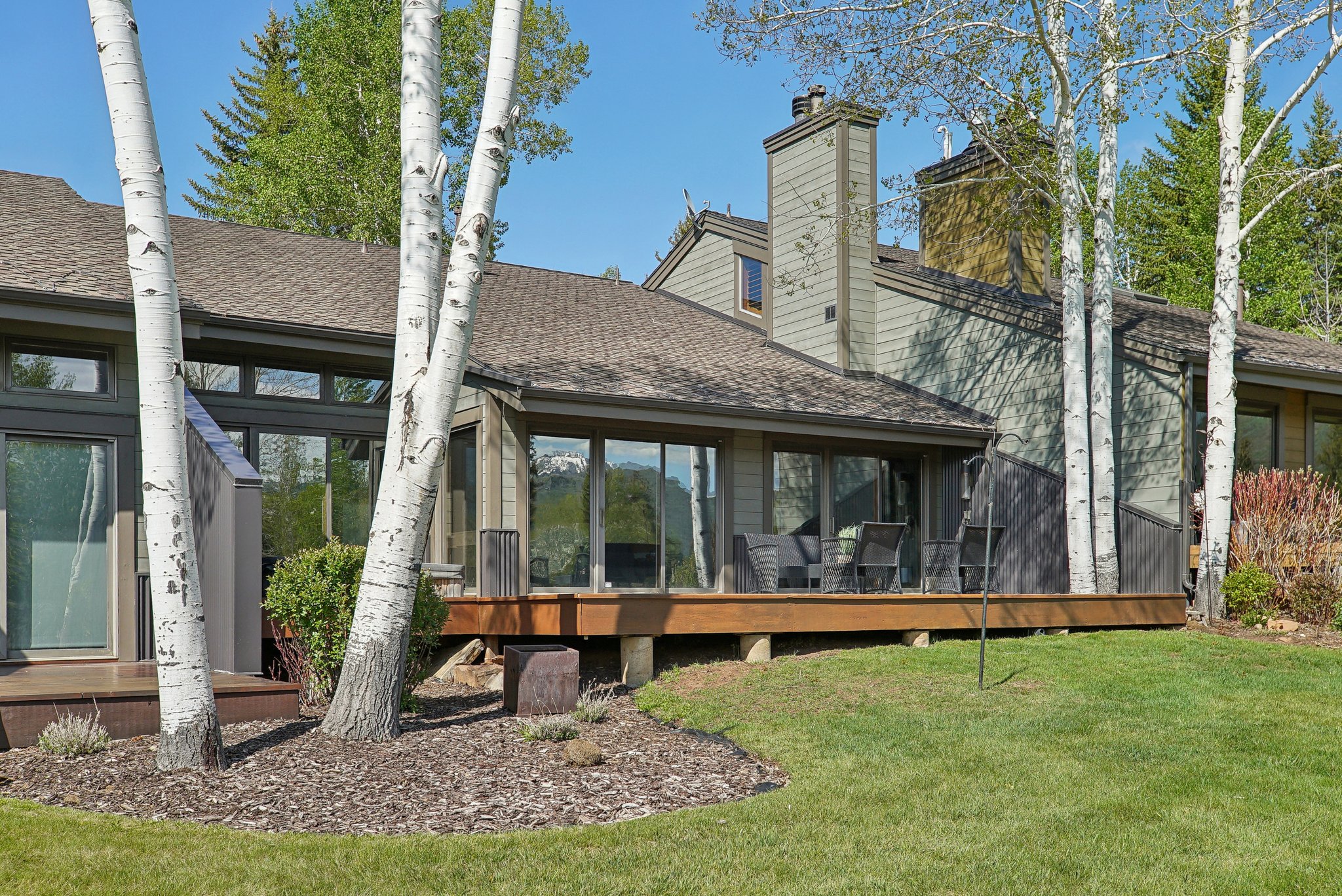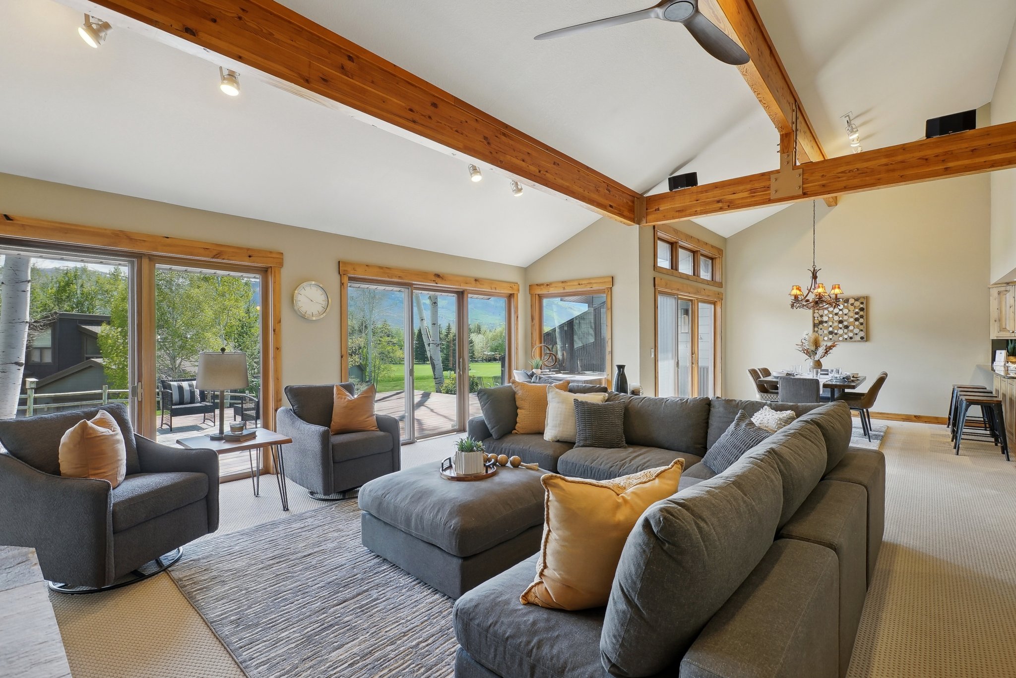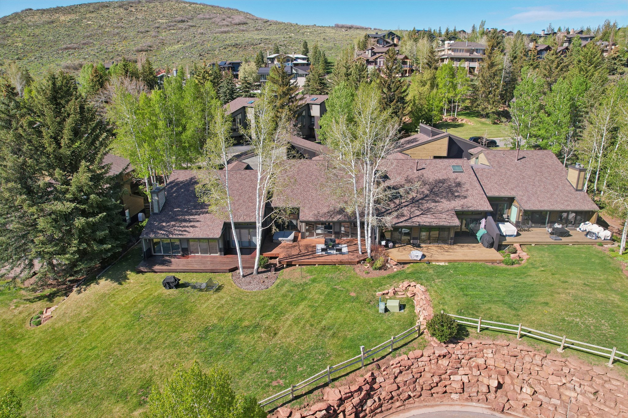 The property lives like a single family home, and features an open floor plan with a large great room with vaulted ceilings and floor-to-ceiling stonework, double master suites, two-car garage, plentiful storage, and upgraded finishes. The expansive deck provides the perfect spot for entertaining, relaxing, and soaking in the mountain views. The property backs to mature landscaping and the Park Meadows golf course, offering privacy for social gatherings and soaks in the hot tub. Free transit stops just few hundred feet away, with direct service to Park City Mountain Resort, Deer Valley, and historic Main Street.
